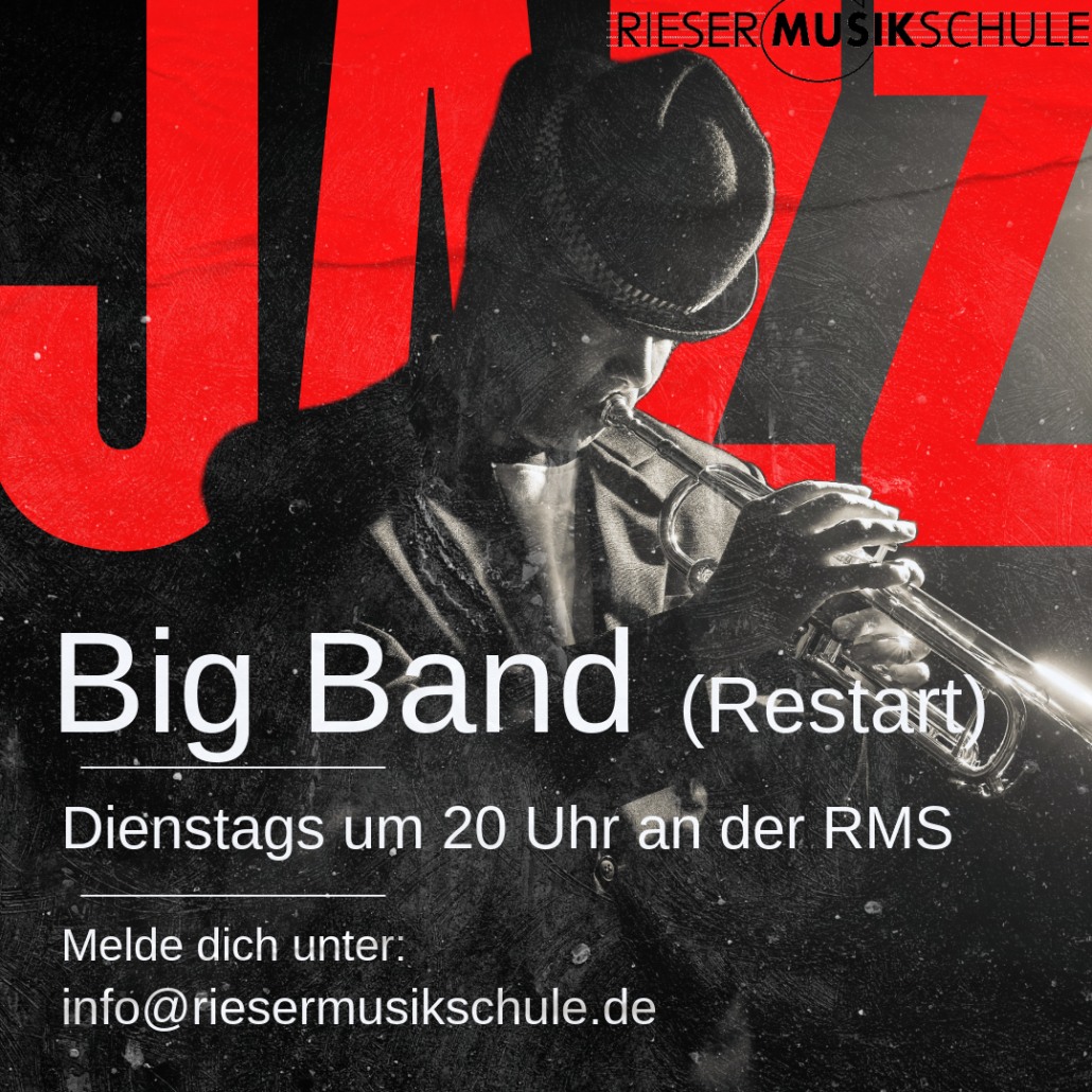 Die Bigband startet hiermit auch einen Aufruf an alle Wiedereinsteiger und/oder Bigband-Neulinge zur ersten Probe am Dienstag, den 11. November um 20 Uhr im Raum 12 der Rieser Musikschule zu kommen. Sehr gerne sind auch Jugendliche und junge Erwachsene gesehen.