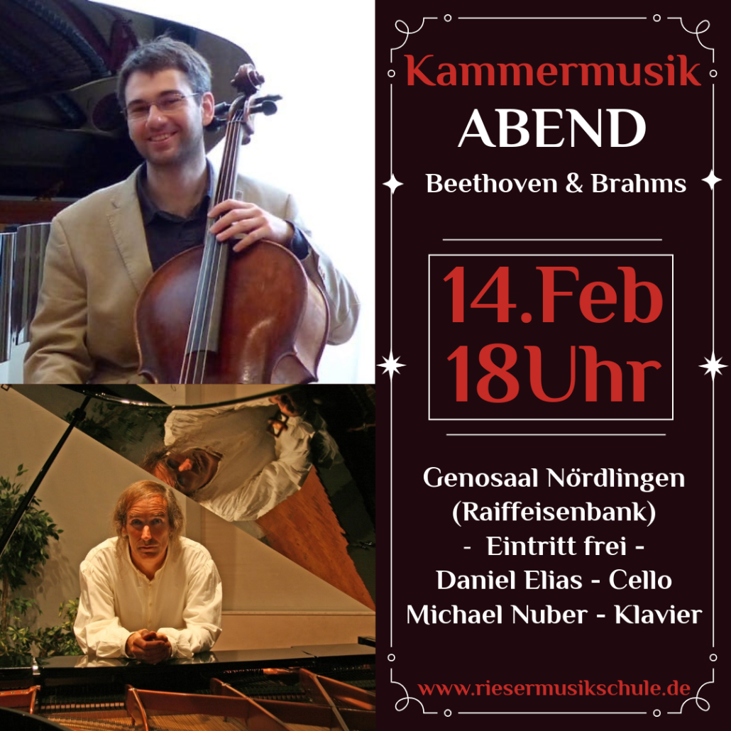 Am Samstag, den 14. Februar 2026, um 18:00 Uhr, findet im Geno-Saal der Raiffeisenbank in Nördlingen (Bei den Kormschrannen 4) ein Kammermusikabend mit zwei Schlüsselwerken der Celloliteratur statt: