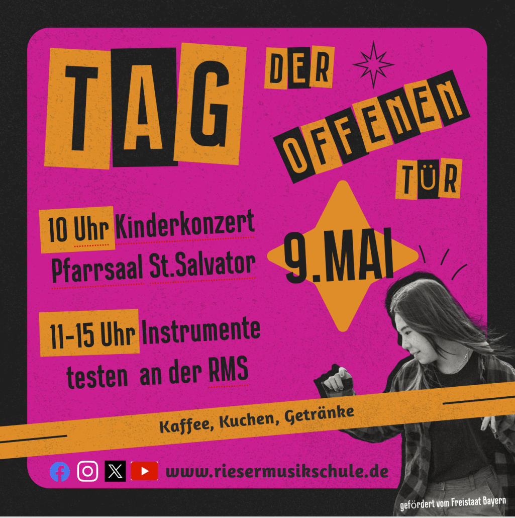 Kinderkonzert um 10 Uhr im Pfarrsaal St. Salvator und im Anschluss von 11 – 15 Uhr Beratung und Instrumente testen in der Rieser Musikschule