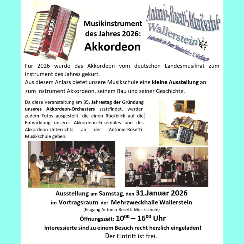 Musikinstrument des Jahres 2026: AKKORDEON, Ausstellung am 31.01.26, 10-16Uhr, Antonio-Rosetti-Musikschule Wallerstein (Mehrzweckhalle)